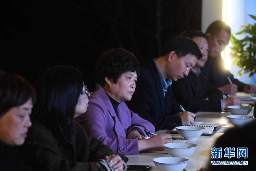 2月22日,全国人大代表、桐庐县江南镇环溪村党总支副书记周忠莲(左三)在桐庐县钟山乡参加“新村夜话”讨论活动。新华社记者 徐昱 摄