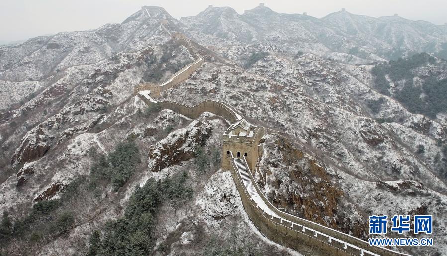 这是2月23日拍摄的金山岭长城雪景(无人机照片)。受冷空气影响,河北省承德市滦平县当日出现降雪天气。雪后的金山岭长城银装素裹,美如画卷。新华社发(王立群 摄)