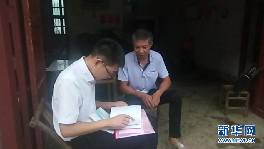 吴应谱(左)在走访贫困户(资料照片)。新华社发(修水县委宣传部供图)