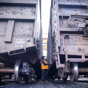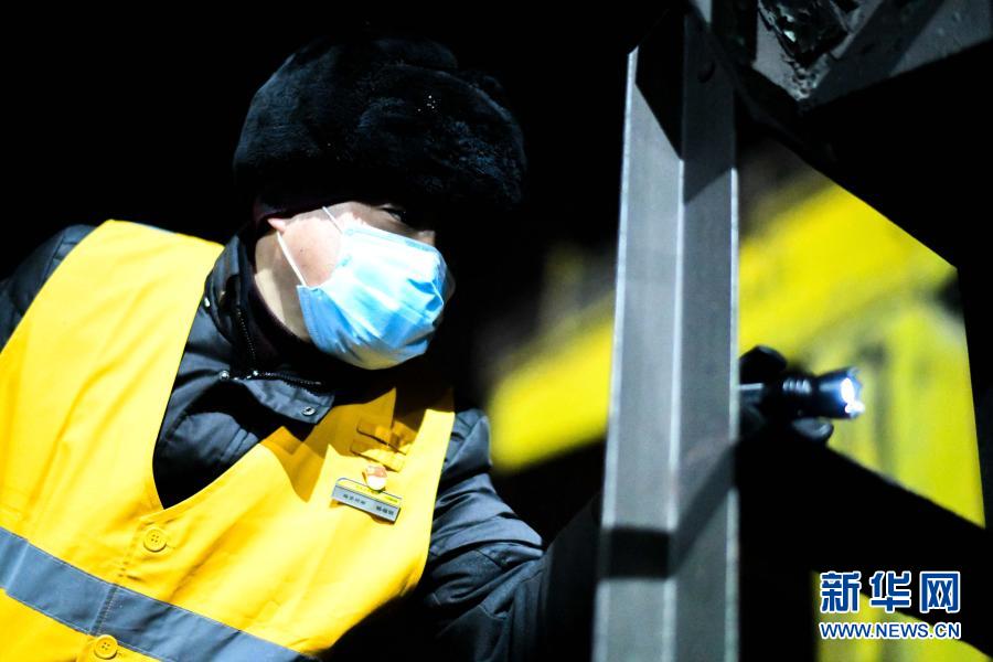 杨福明在绥芬河铁路口岸站进行列车装载质量复检验收作业(2月22日摄)。新华社记者 王松 摄