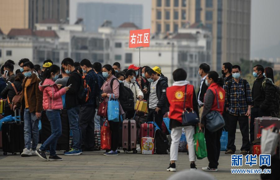 2月23日,来自百色市右江区的务工人员在百色火车站定点集中,等候工作人员分发车票。新华社记者 张爱林 摄
