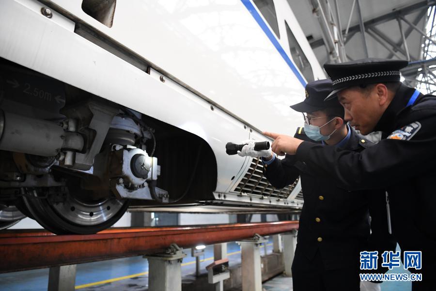 2月23日,重庆铁路公安处消防支队民警彭川(右)和随车机械师在对列车走行部进行检查。新华社记者 唐奕 摄