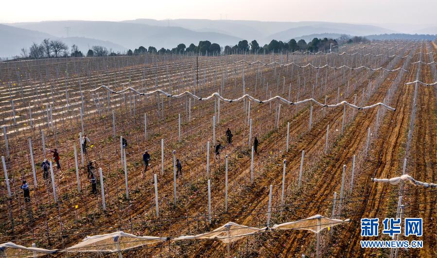 2月23日,陕西省延安市宜川县英旺乡柏塔村的果农在果园里为苹果树修枝(无人机照片)。近日,随着气温回暖,陕西省延安市宜川县的广大果农积极储备农资,开展技术培训、果园管理、果品销售等春季农业生产工作,一派繁忙景象。新华社记者 陶明 摄