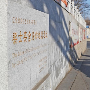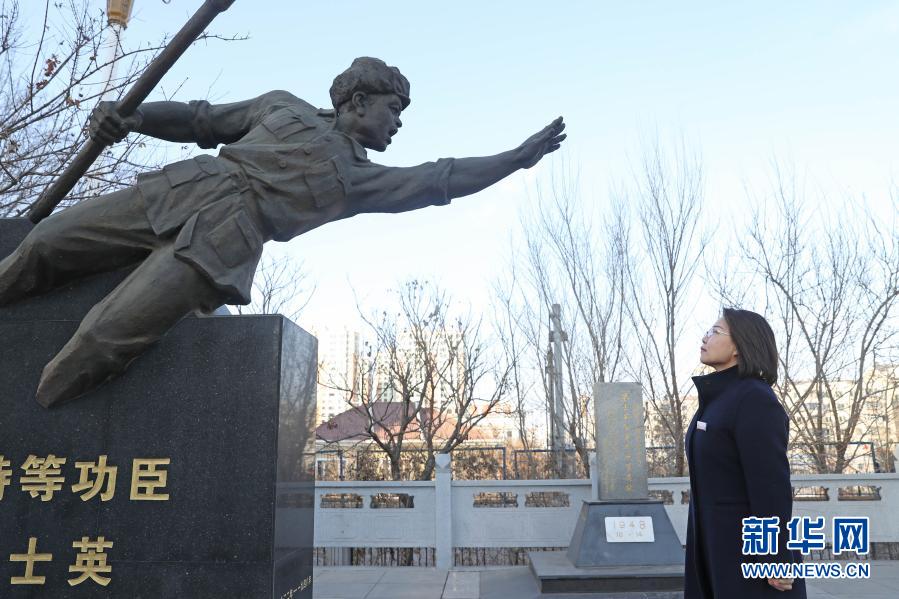 2月2日,梁士英烈士的孙女梁丹丹在梁士英舍身炸地堡遗址瞻仰爷爷雕像。新华社记者 杨青 摄