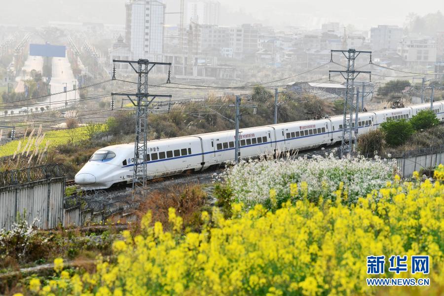 早春时节,贵州省黔东南苗族侗族自治州境内的油菜花、桃花、樱花次第盛开,动车组列车穿行其间,一路繁花,美不胜收。