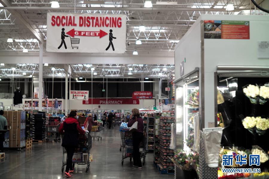 2月23日,美国加利福尼亚州福斯特城的开市客超市里悬挂着提示保持社交距离的横幅。新华社记者 吴晓凌 摄