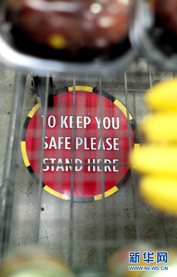 这是2月23日在美国加利福尼亚州福斯特城的开市客超市拍摄的地面上提示保持一定距离的标识。新华社记者 吴晓凌 摄