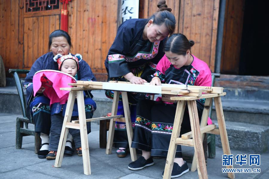 施林娇(右一)在十八洞村学习苗绣(2020年4月25日摄)。新华社记者薛宇舸摄