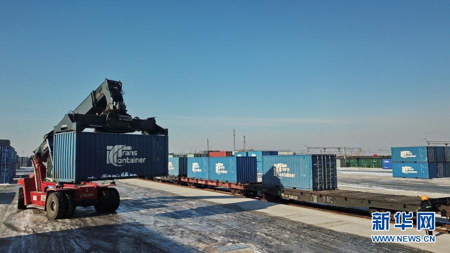 2月24日,在长春国际陆港,工作人员操作正面起重机向中欧班列上搬运货柜(无人机拍摄)。