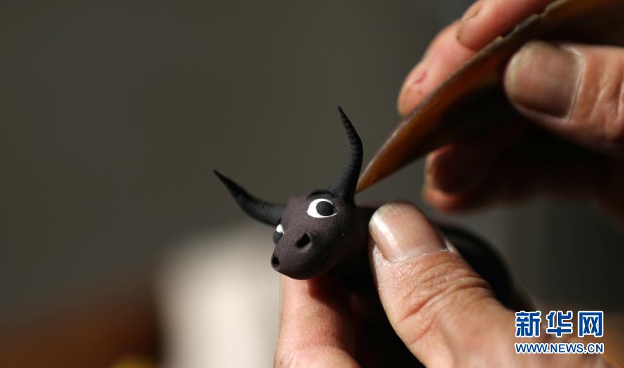 2月23日,在山东省临沂市郯城县泉源镇东三汪村,面塑民间艺人郑继成在创作面塑“春牛”。新华社发(张春雷 摄)