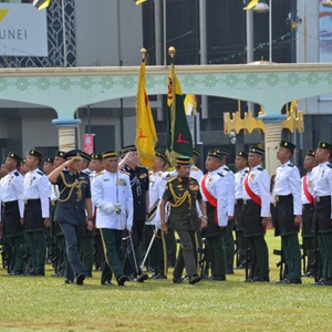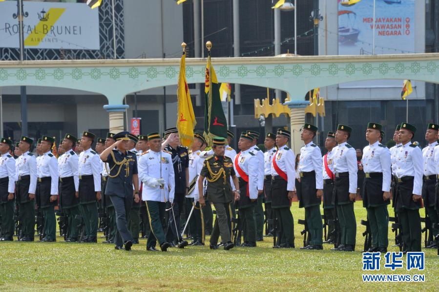 2月23日,在文莱首都斯里巴加湾市中心赛福鼎广场,文莱国家元首、苏丹哈桑纳尔·博尔基亚(前右一)检阅仪仗队。