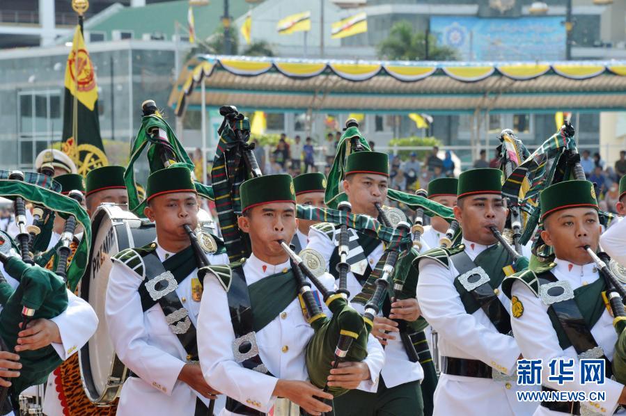 这是2月23日在文莱首都斯里巴加湾市中心赛福鼎广场拍摄的阅兵游行庆祝活动现场。新华社发(杰弗里·黄摄)