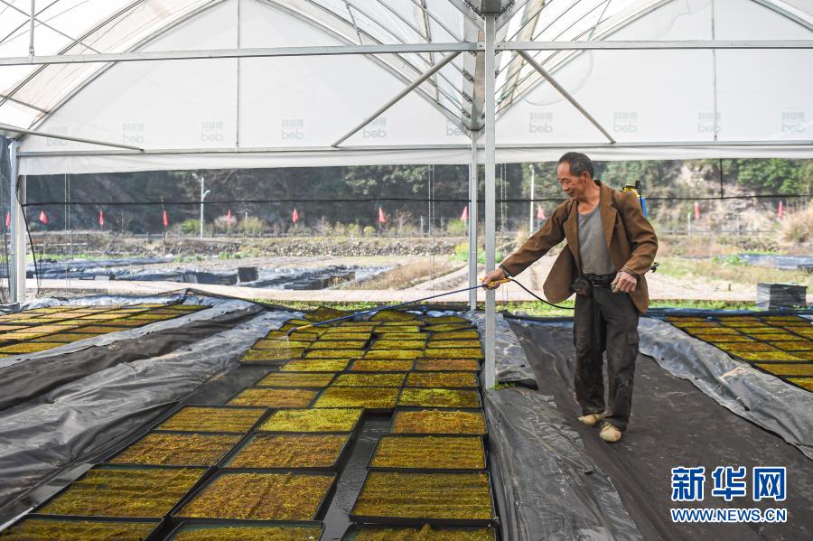2月24日,在毛垟乡苔藓种植基地的大棚内,村民为苔藓喷洒营养液。