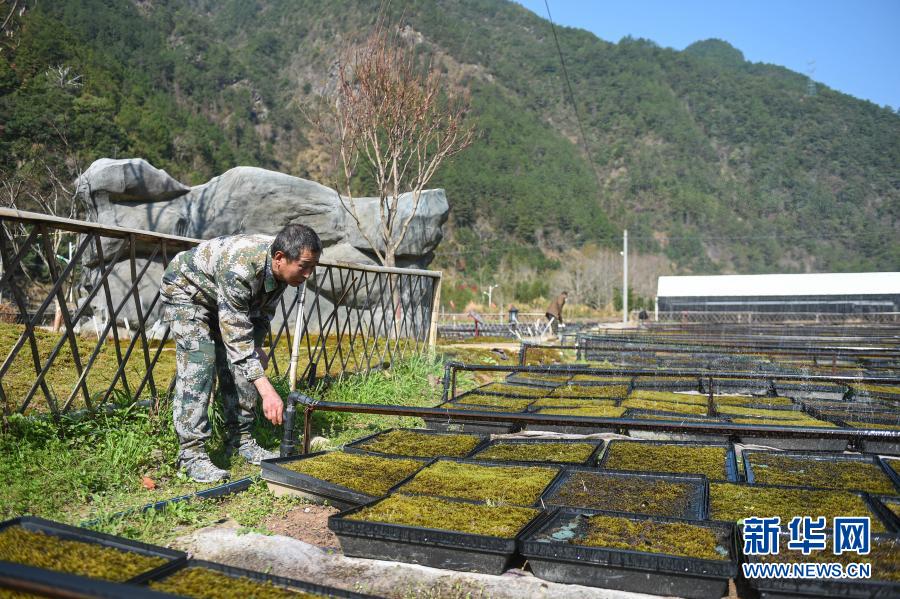 2月24日,在毛垟乡苔藓种植基地内,村民为苔藓浇水。