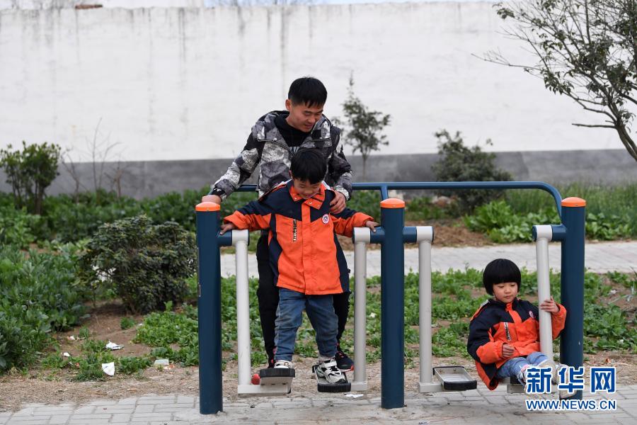 2月23日,常胜带着孩子在村广场上玩耍。新华社记者 刘军喜 摄