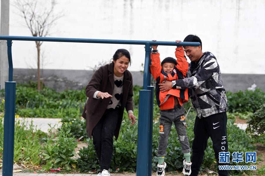 2月23日,常胜夫妻带着孩子在村广场上玩耍。新华社记者 刘军喜 摄