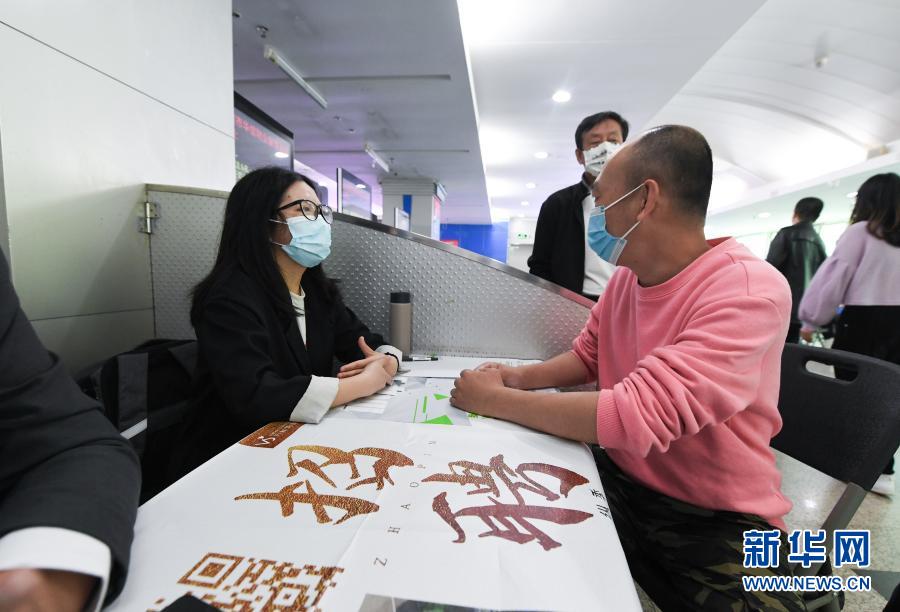 2月24日,求职人员(右)在招聘会现场与企业招聘人员交流。