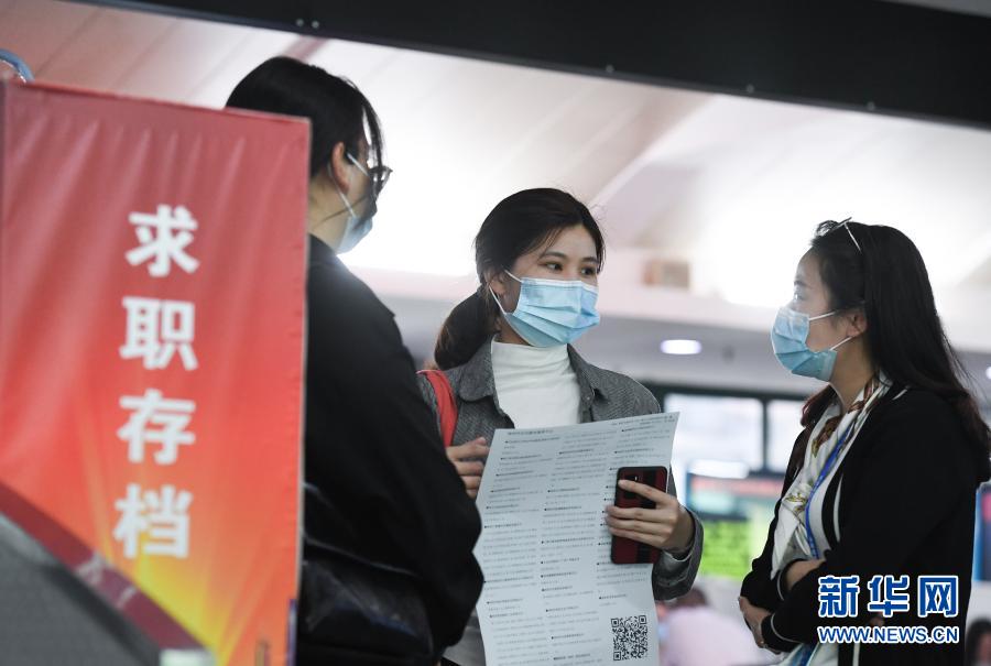 2月24日,求职人员在招聘会现场与企业招聘人员(右)交流。