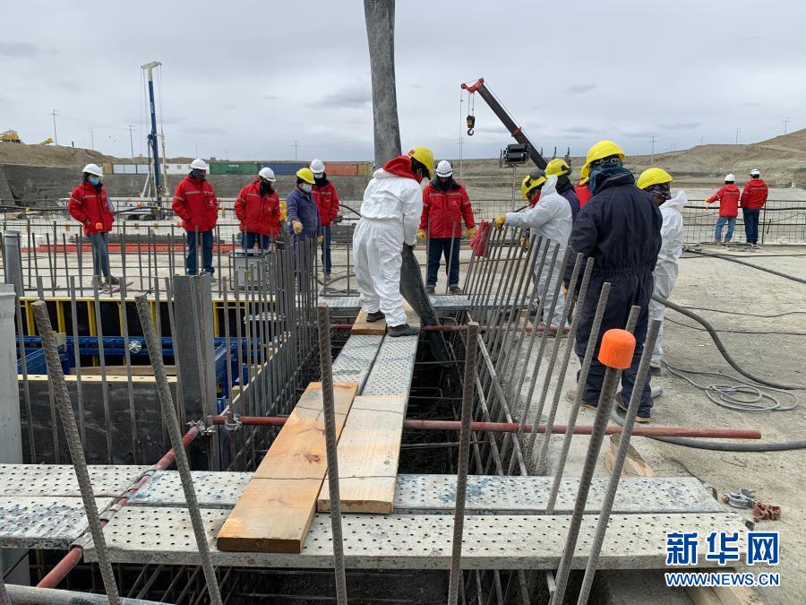 2020年9月29日,在阿根廷圣克鲁斯省,工人在孔多克里夫与拉巴朗科萨水电站(简称孔拉水电站)厂房进行混凝土浇筑。作为中阿最大合作项目,孔拉水电站是中国能建葛洲坝集团承建的世界最南端水电站。水电站建成后,不仅将明显提升阿根廷发电水平,每年还可为该国节约11亿美元燃油进口外汇。新华社发(中国能建葛洲坝集团阿根廷孔拉水电站项目部供图)