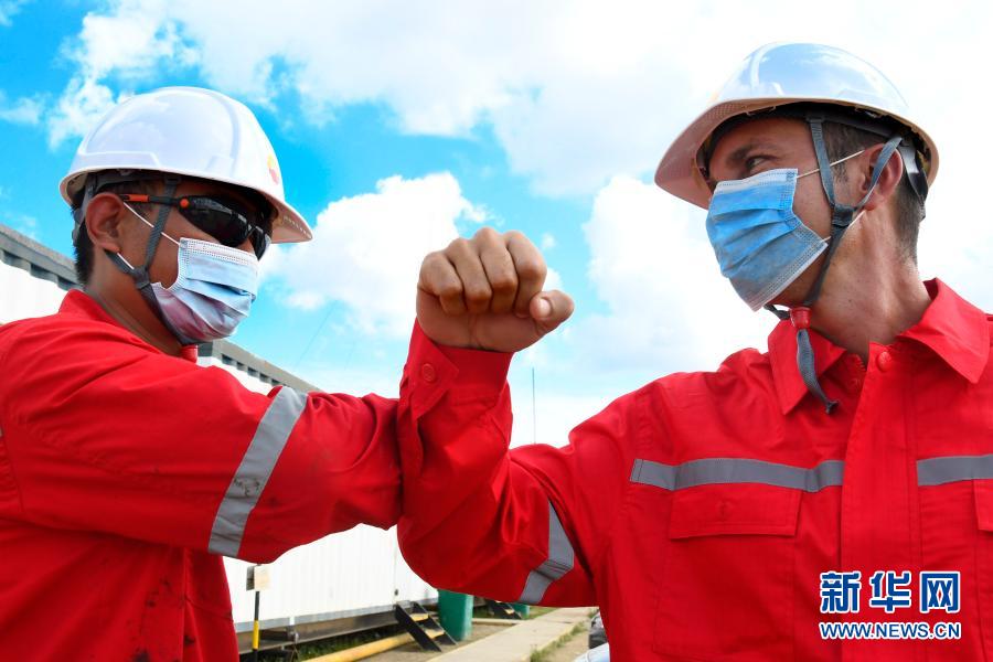 2020年11月27日,中国石油集团长城钻探工程公司古巴项目GW91钻井平台中方员工(左)同古方员工互相致意。新华社发(华金·埃尔南德斯摄)