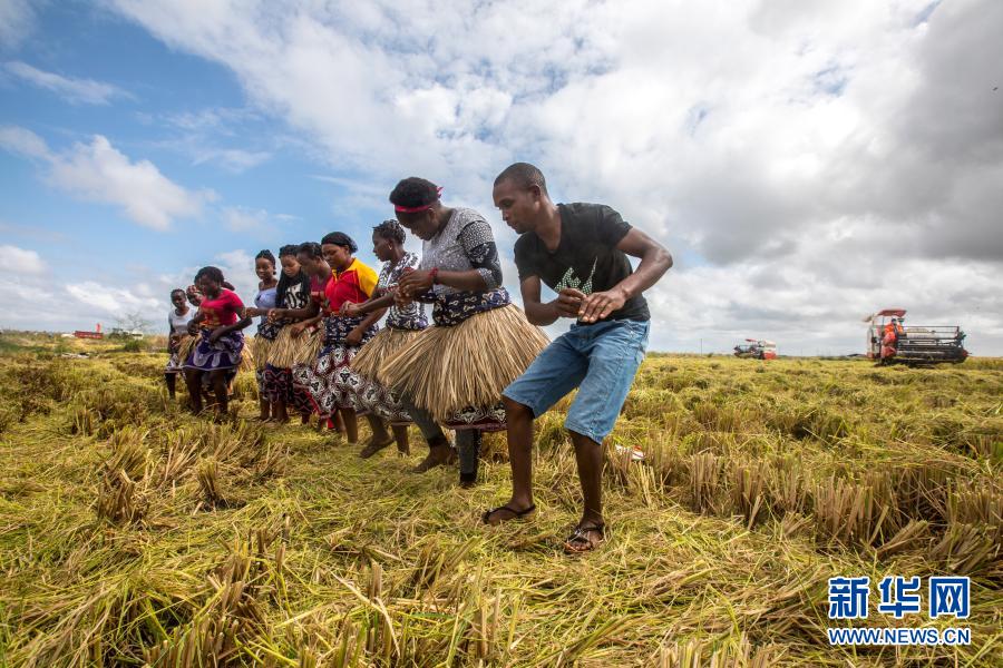 2019年4月7日,在莫桑比克万宝莫桑农业园,农户在水稻收割现场载歌载舞庆祝丰收。万宝莫桑农业园是中国在非洲最大规模水稻种植项目,极大地缓解了莫桑比克粮食短缺问题。新华社记者 张宇 摄