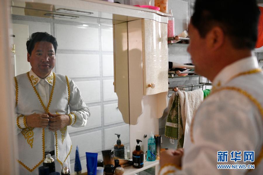 2月23日,马瑞峰在家中穿上演出服装,准备网络直播。新华社记者 唐如峰 摄