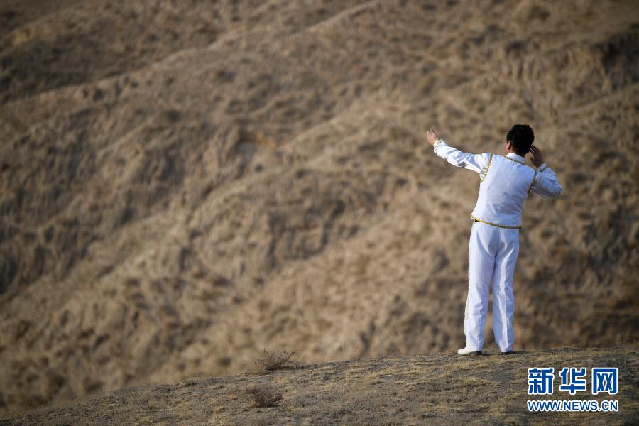 2月23日,马瑞峰在家乡的山头高唱自编的“花儿”《百姓的生活比蜜甜》。新华社记者 王鹏 摄