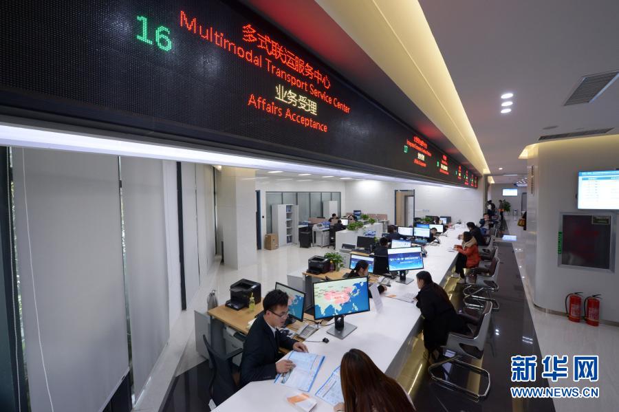 在中国(河南)自由贸易试验区郑州片区综合服务中心,工作人员在办理多式联运业务(2018年11月20日摄)。河南自贸试验区以制度创新为核心,优化营商环境释放发展动能,畅通开放通道实现买卖全球,在内陆腹地筑起开放型经济发展高地。