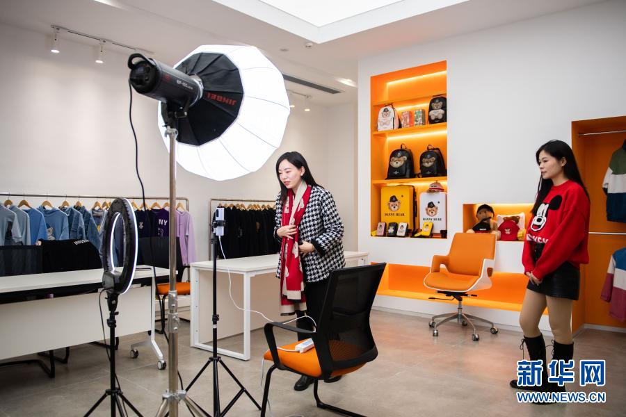 在中国(湖南)自由贸易试验区长沙片区的中非经贸合作促进创新示范园内,主播在中非直播电商孵化中心直播间里直播带货(2020年12月25日摄)。自贸区获批后,湖南探索打造中非经贸深度合作先行区,迎来宝贵的发展机遇。