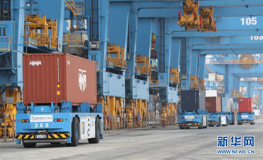 1月14日,在位于中国(山东)自由贸易试验区青岛片区的青岛港全自动化码头,自动导引车来回穿梭装运货物。 中国(山东)自由贸易试验区设立以来,一系列大胆试、大胆闯、自主改的政策逐步落实,制度创新打通堵点、释放活力。山东以自由贸易试验区作为对外开放的重要抓手,深化与日韩交流合作,聚焦海洋经济创新发展,稳旧拓新开拓国际市场。