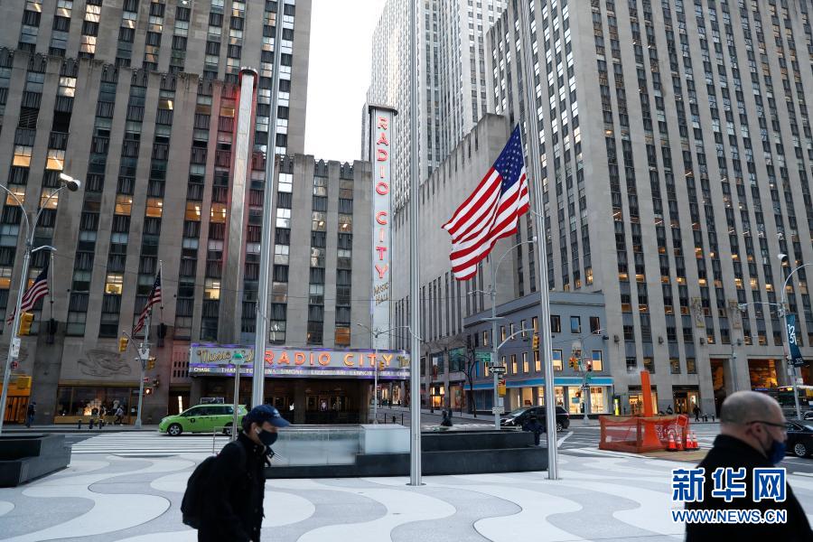 2月24日,美国纽约一座大楼外的美国国旗降半旗悼念新冠逝者。