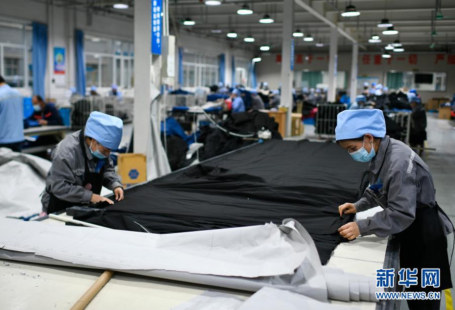 2月24日,宁夏同心县中核(宁夏)同心防护科技有限公司扶贫车间的女工在进行服装加工。