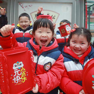 2月25日,在江苏省扬州市文汇街道春江社区,小朋友展示自己制作的花灯。
