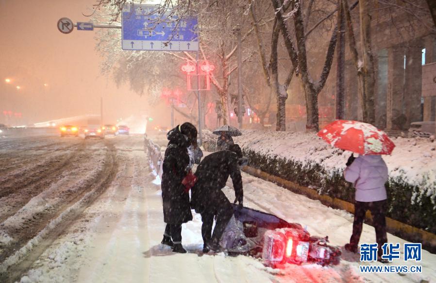 2月24日晚,在郑州市花园路街道,一名市民骑车摔倒,路人上前帮忙。新华社记者 郝源 摄