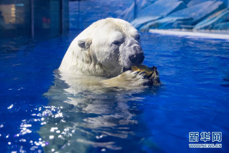 2月25日,在哈尔滨极地馆内,北极熊在吃特制的“元宵”大餐。新华社发(张涛 摄)