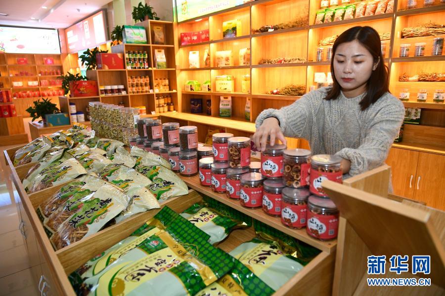 2月24日,宁夏吴忠市同心县“大美同心”电商平台工作人员在整理展出的当地农特产品。