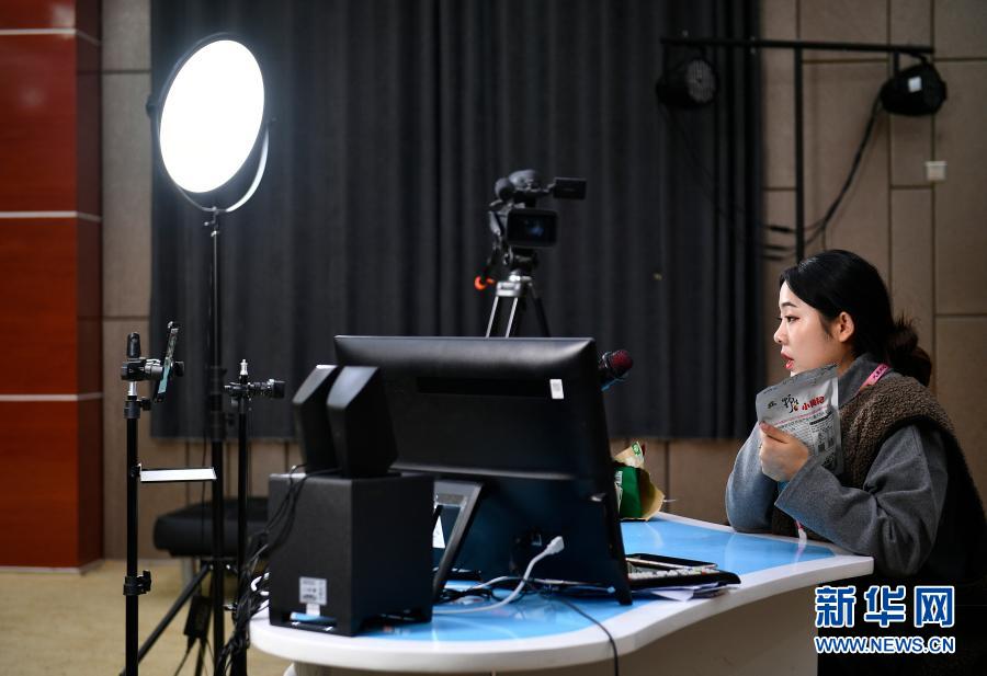 2月24日,宁夏吴忠市同心县“大美同心”电商平台网络主播在直播推介当地的农特产品。新华社记者 王鹏 摄