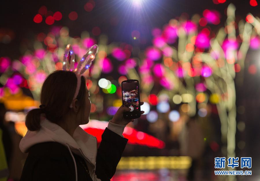 2月24日,一名女子在陕西西安大唐不夜城步行街用手机拍摄彩灯。新华社记者 魏翔 摄