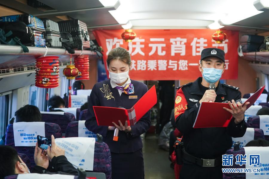2月25日,在C3858次列车上,乘警和乘务员在朗诵诗歌《盛世中国》。当日,南京铁路公安处乘警支队在南京开往上海的C3858次列车上举办“警民联欢迎元宵”活动。