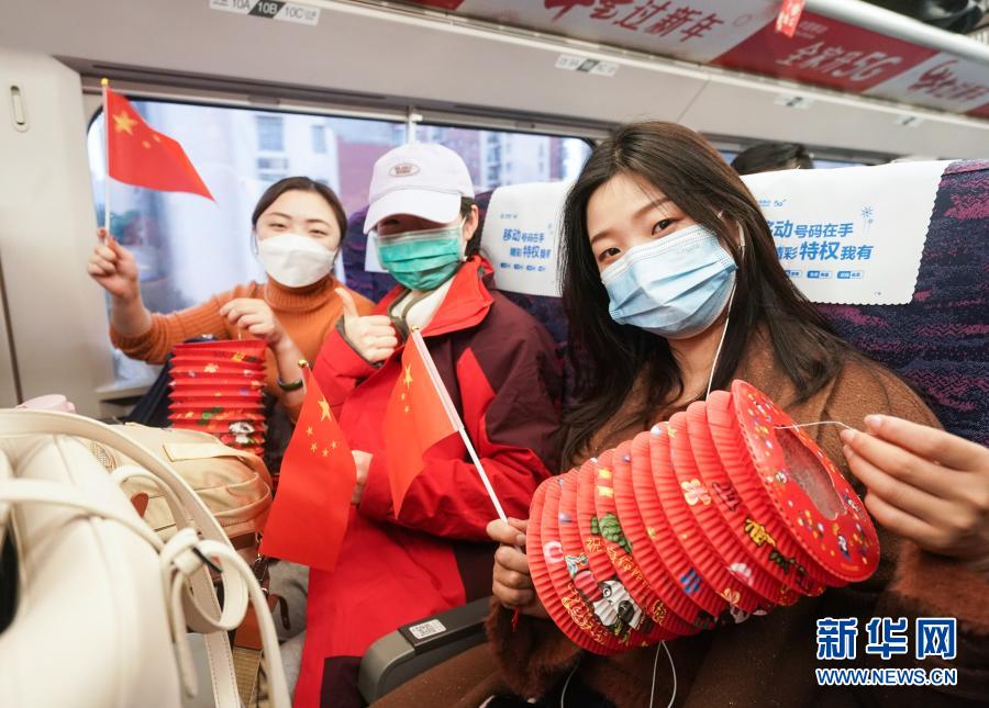 2月25日,在C3858次列车上,旅客拿着节日礼物合影。当日,南京铁路公安处乘警支队在南京开往上海的C3858次列车上举办“警民联欢迎元宵”活动。