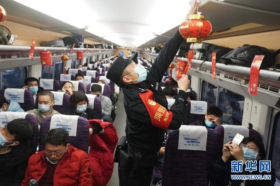 2月25日,在C3858次列车上,乘警在布置车厢。当日,南京铁路公安处乘警支队在南京开往上海的C3858次列车上举办“警民联欢迎元宵”活动。