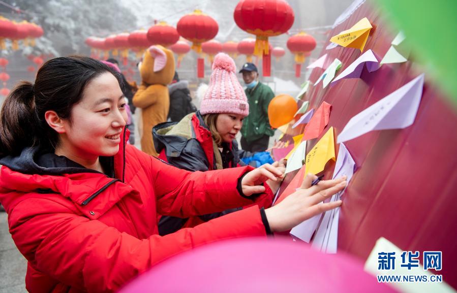 2月25日,游客在陕西华山西峰“心愿墙”写祝福。