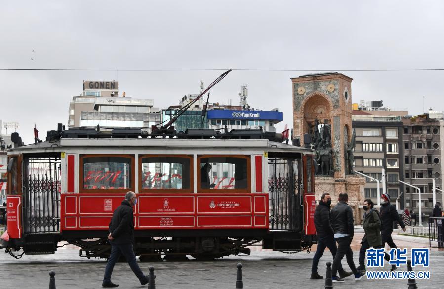 2月25日,在土耳其伊斯坦布尔的塔克西姆广场,行人从有轨电车前走过。