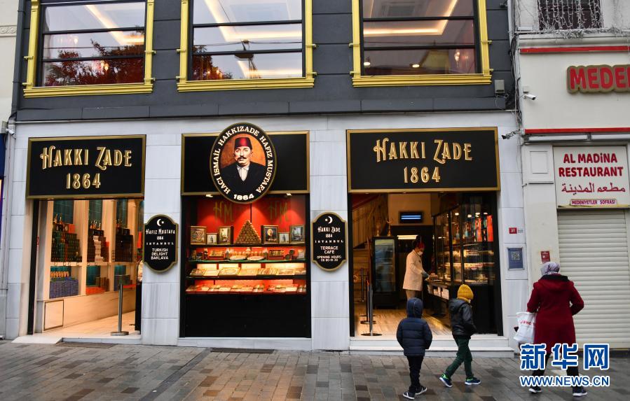 2月25日,在土耳其伊斯坦布尔的商业步行街,行人经过一家销售土耳其传统糕点的商店。