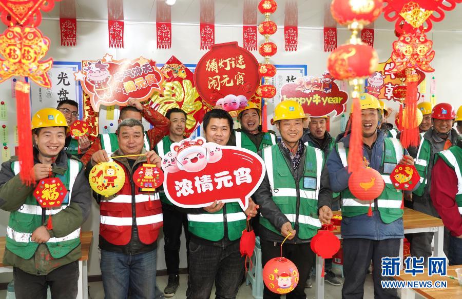 当日,在雄安新区的中建三局二公司北京公司雄安G2组团安置房项目建设工地,工人们坚守岗位,在工地共同迎接元宵佳节。工友们自己制作花灯,猜灯谜,吃元宵,互致节日祝福。