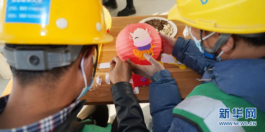 2月25日,在雄安新区G2组团安置房项目建设工地食堂,工友们制作花灯。新华社记者 才扬 摄