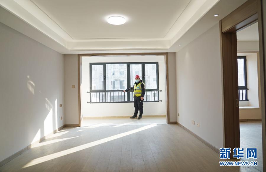 2月25日,在雄安新区G2组团安置房项目建设工地,工作人员展示精装修交付样板间。新华社记者 才扬 摄