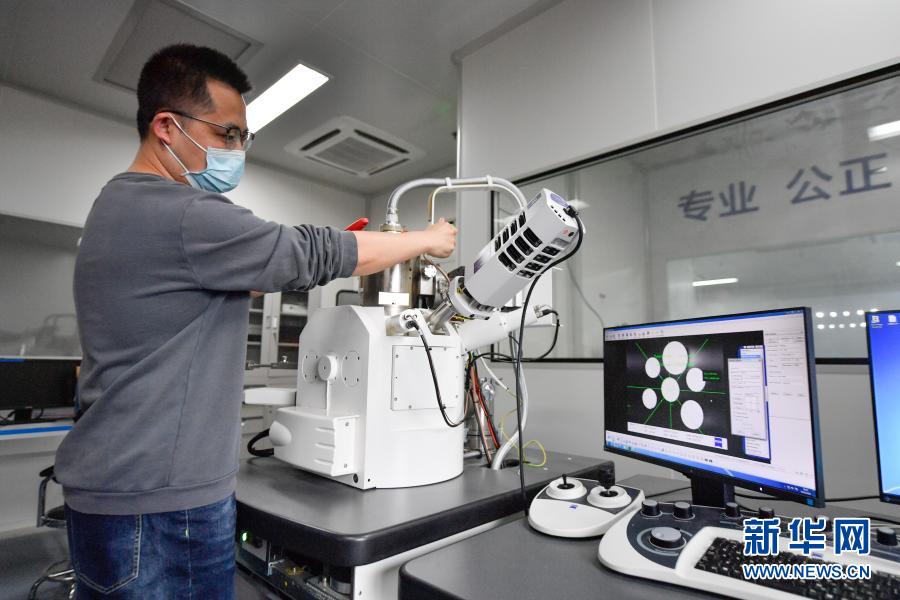 2月24日,在清华大学天津高端装备研究院润滑与摩擦检测中心,工程师在调试场发射扫描电子显微镜。新华社发(孙凡越 摄)