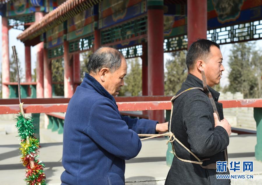 2月22日,在山西省代县峨口镇的峨峰公园,郝来喜(左)在帮儿子郝永俊穿戴表演挠阁的工具。