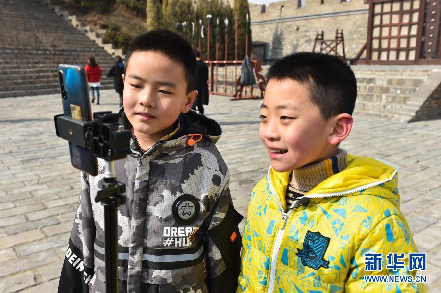 2月23日,在山西省代县雁门关,郝锦程(右)在向网友们介绍挠阁。